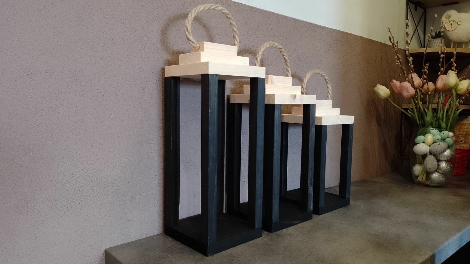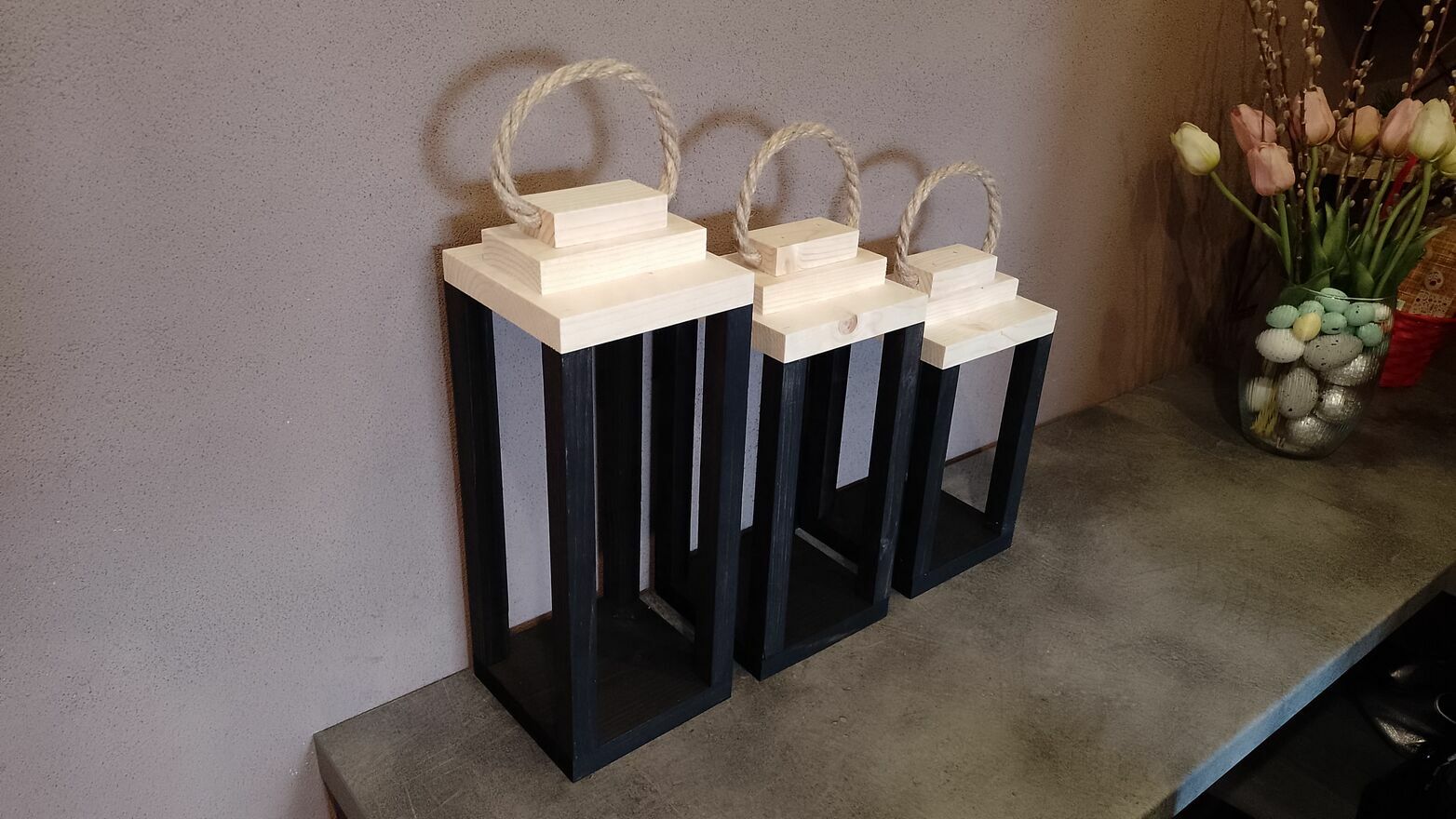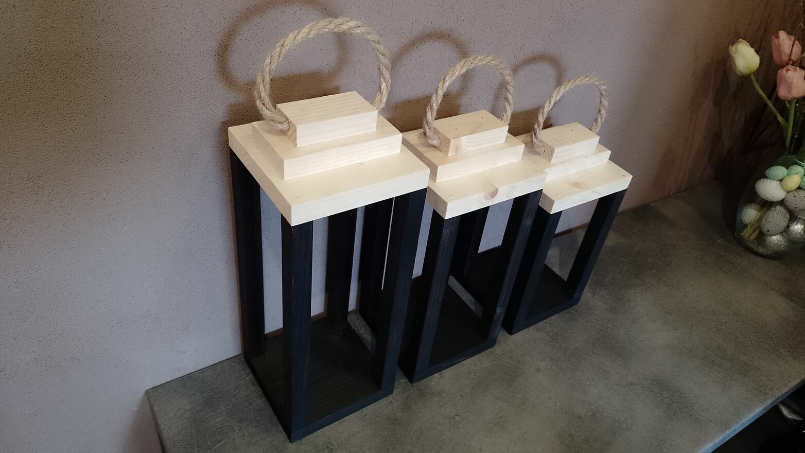 Sprzedam zestaw pięknych lampionów z litego drewna(nie sztucznej sklejki z innych aukcji)Wymiary ok 14x14cm podstawa,wysokości ok 38cm,33cm i 28cm + wysokość liny jutowej.