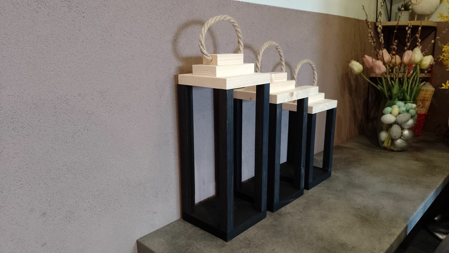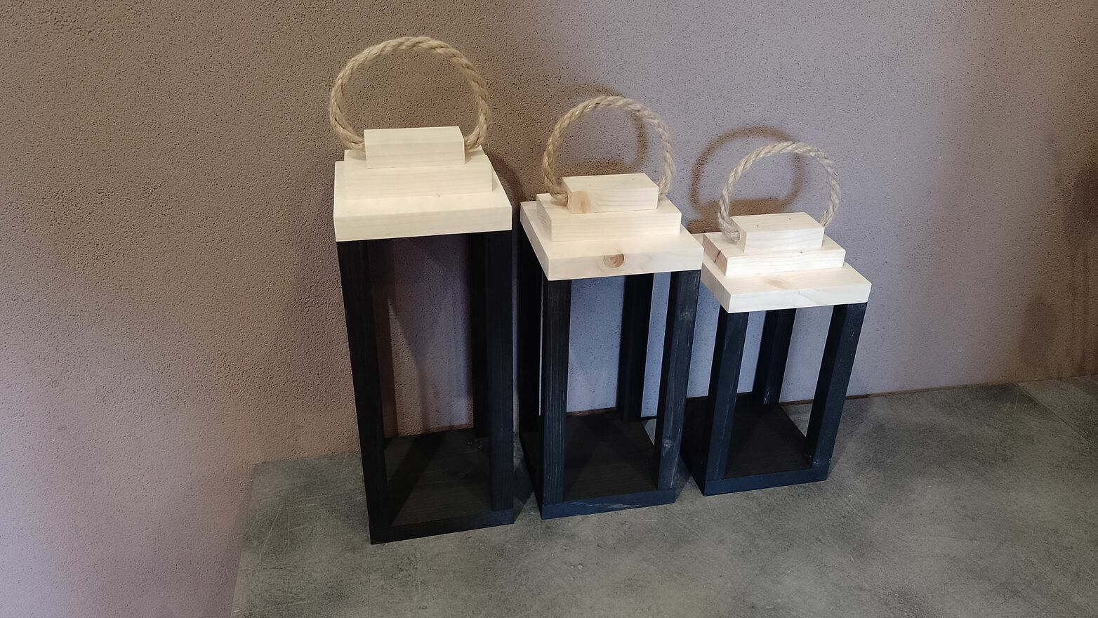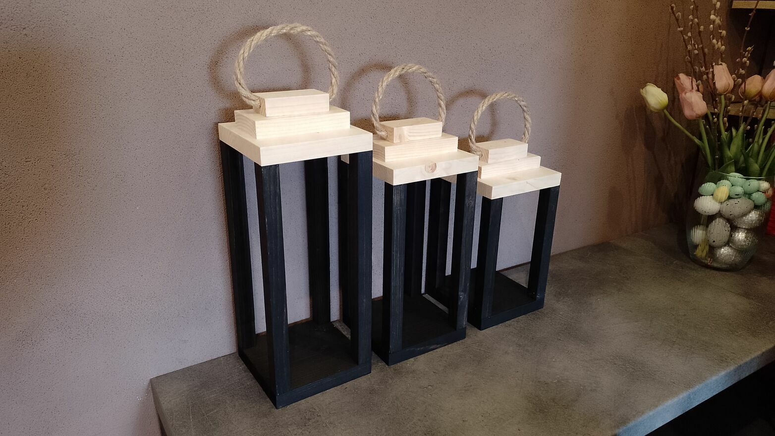 Sprzedam zestaw pięknych lampionów z litego drewna(nie sztucznej sklejki z innych aukcji)Wymiary ok 14x14cm podstawa,wysokości ok 38cm,33cm i 28cm + wysokość liny jutowej.