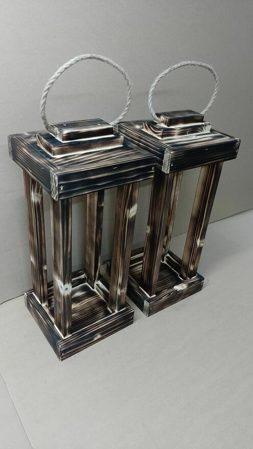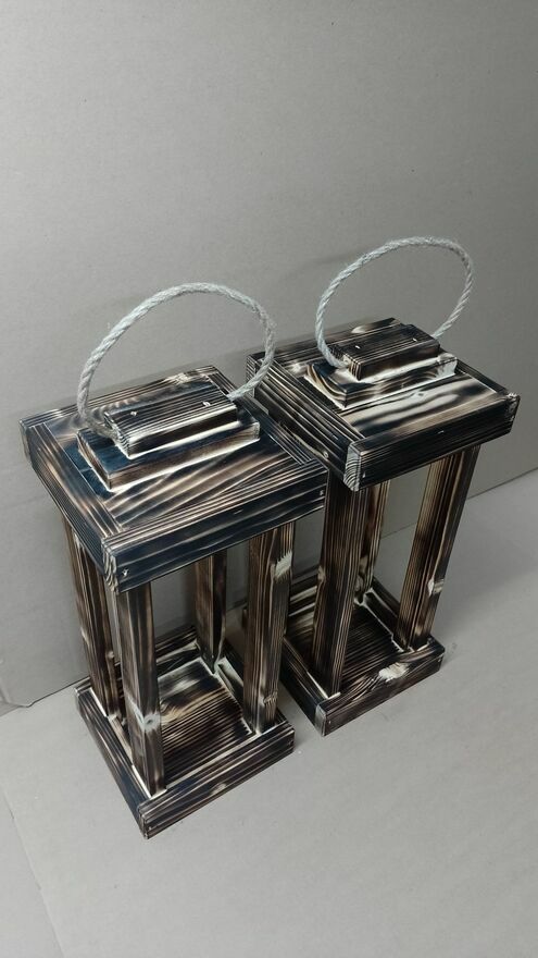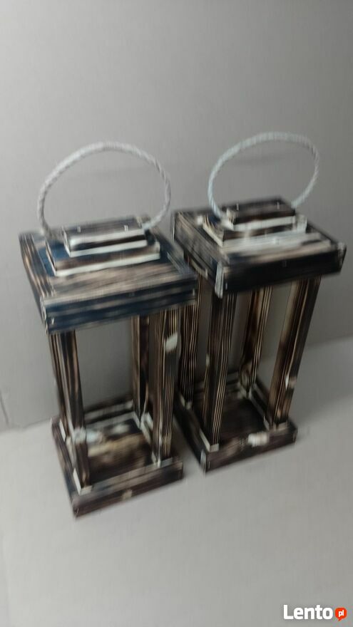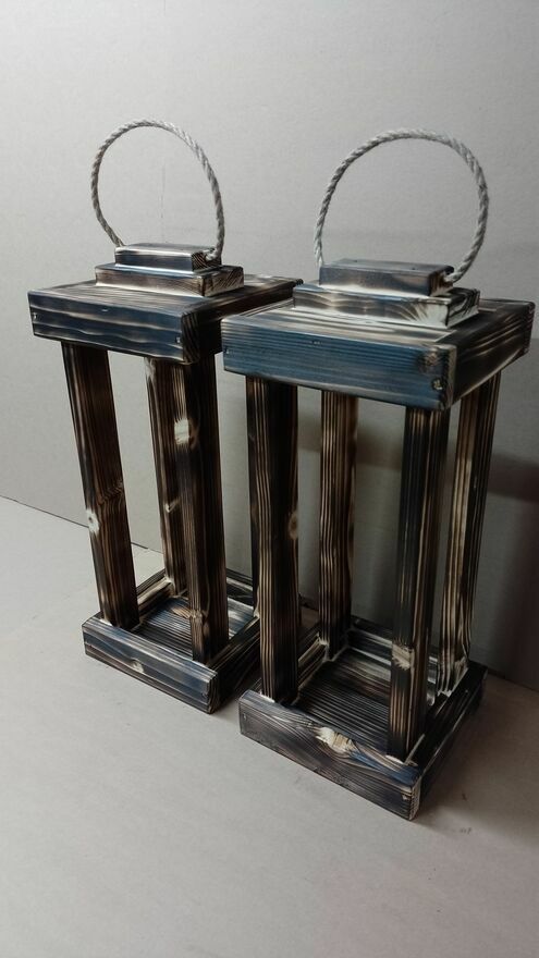 Lampion drewniany ok 47cm wysoki, podstawy ok 20x20cm. OPALANY.Oferuję własnoręcznie wykonane lampiony z drewna po suszarni, produkt mojej produkcji nie masowej więc lepiej wykonany i wykończony.