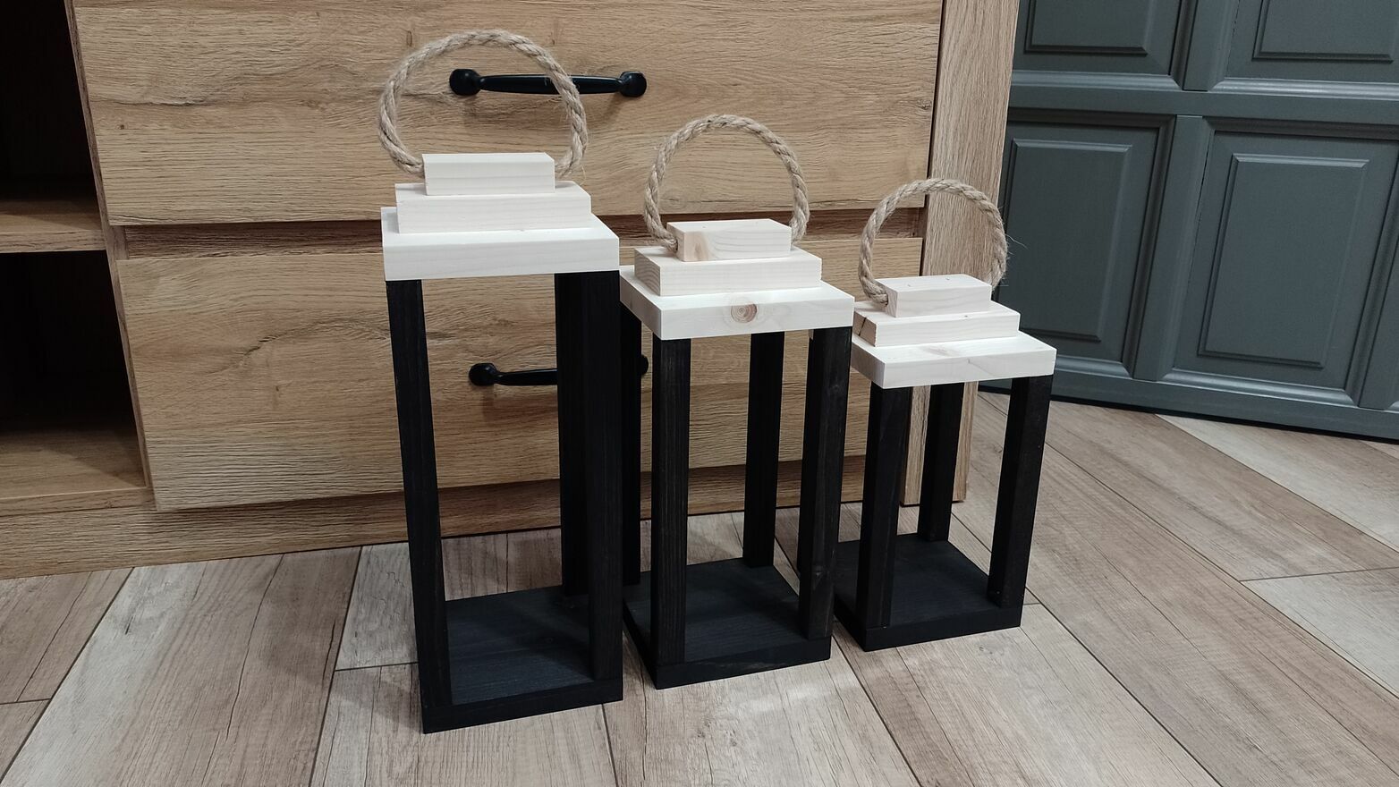 Sprzedam zestaw pięknych lampionów z litego drewna(nie sztucznej sklejki z innych aukcji)Wymiary ok 14x14cm podstawa,wysokości ok 38cm,33cm i 28cm + wysokość liny jutowej.